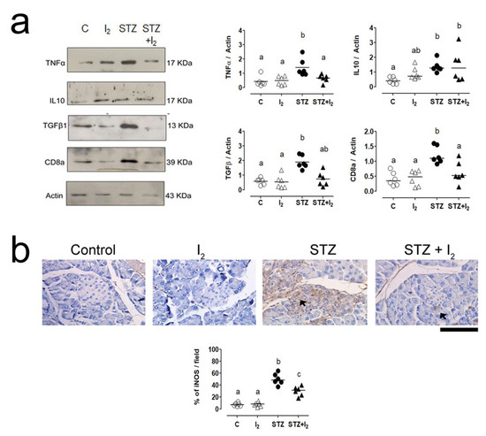 Figure 5 shows the markers associated with the inflammatory immune response. STZ administration increased the presence of TNFα, IL10, TGFβ and CD8a in pancreas tissue (Figure 5a). iNOS was highly expressed in the acinar and islet cells of STZ animals (Figure 5b). The I2 supplement attenuated these proinflammatory conditions by impairing the activation intensity of the immune response.