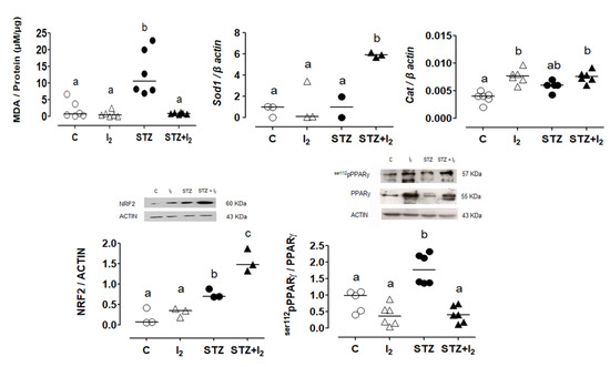Figure 6 summarizes the proposed explanation for the preventive action of I2 supplementation in the STZ model. The higher amount of MDA in STZ mice corroborates the pancreatic oxidative state of these animals. The partial increase in antioxidant markers, such as Nrf2, Sod1 and Cat, indicates a physiological response to these conditions, which, however, seems insufficient to neutralize lipoperoxidation. I2 supplementation exerted an effective antioxidant effect by eliciting the highest expression of antioxidant markers, thus preventing the oxidative environment (MDA at basal levels). The presence of the I2 supplement also prevented the 112 phosphorylation of PPARγ, maintaining its activated form.