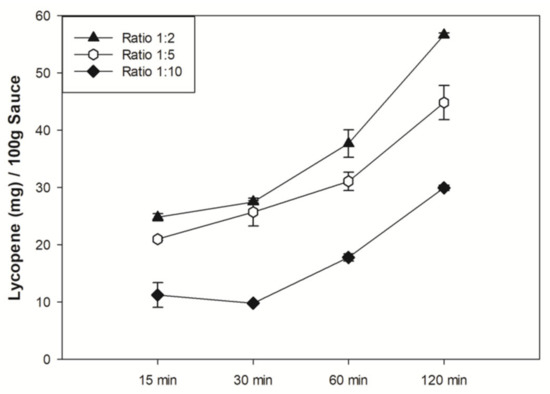 The extractions of lycopene from the semi-solid matrix were performed in Pyrex beakers always covered with aluminum foils, in order to prevent light-based degradation. In detail, sauce samples were mixed with an increasing amount of solvents (sauce−solvents ratios of 1:2, 1:5, 1:10, and 1:20) for different time points (10, 60, 120, and 240 min) under continuous stirring.
