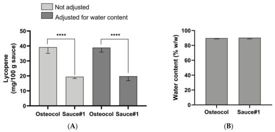 Lycopene content (mg/100 g sauce) in Osteocol and Sauce#1 ((A)—left) and data adjusted ((A)—right) as a function of the water content in each sauce (B). All data are the means of three different experiments ± standard deviation (Student’s t-test **** p < 0.001).