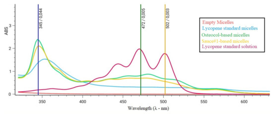 The encapsulation of lycopene in Tween micelles resulted in a shift of the characteristic spectrophotometric signal usually obtained with lycopene (main peak ~472 nm), with the onset of a new and specific peak characterizing the micellar complex between 345 and 350 nm (Figure 3). The intensity of signals obtained at this new wavelength was used for estimating the lycopene exact concentration in the micelles.