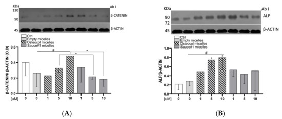 (A) Influence exerted by lycopene loaded micelles on β-catenin pathways protein levels; (B) influence exerted by lycopene loaded micelles on ALP protein expression. Cell proteins were analyzed by Western blotting with specific antibodies for each pathway. All data are the means of three different experiments ± standard deviation. Statistical analysis: Student’s t-test vs. 0 * p < 0.05; linear regression # p < 0.05.