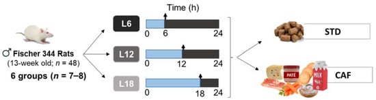 Forty-eight 13-week-old male Fisher 344 rats from Janvier Laboratories (Le Genest-Saint-Isle, France) were housed in pairs at standard conditions (22 °C, 65% relative humidity and 12:12 h light/dark cycle). After one week of adaptation to the facility with free access to food and water, animals were weighed and randomly distributed under specific light-dark cycles to simulate three specific photoperiods: short photoperiod (L6, 6 h light/18 h darkness), standard photoperiod (L12, 12 h light/12 h darkness), or long photoperiod (L18, 18 h light/6 h darkness). In each photoperiod, rats were fed either a standard chow diet (STD) (72% carbohydrate, 8% lipid, and 19% protein; Safe-A04c, Scientific Animal Food and Engineering, Barcelona, Spain) or a cafeteria diet (CAF) composed of highly palatable and energy-dense human foods (58% CH, 31% lipid, and 11% protein) for 9 weeks (6 groups, n = 7–8 per group) (Figure 1). CAF diet was freshly prepared every day as previously described [31]. Body weight and food intake were recorded weekly during the whole experimental procedure.