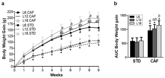 CAF-fed rats showed a significant increased body weight gain (p < 0.001) and corresponding AUC compared to STD-fed rats under the three different photoperiod conditions across the 9 weeks of the experiment (Figure 2a,b).