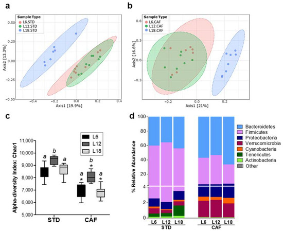 PERMANOVA analysis of fecal microbiota beta diversity revealed a significant CAF effect under each photoperiod condition (Figure S2). In addition, a significant photoperiod effect in both STD- (p < 0.001) and CAF-fed (p < 0.001) rats under L18 conditions was found (Figure 3a,b). Interestingly, the CAF effect on rats housed under L18 conditions was stronger than in both L6 and L12. Thus, samples were grouped according to diet type along the PC1 axis. (Figure S2c).