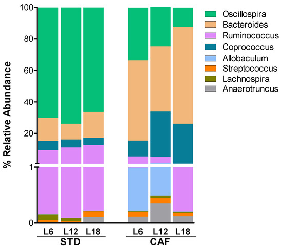Furthermore, photoperiod housing conditions also affected gut microbiota composition at this taxonomical level, mainly in CAF-fed rats (Figure 4; Table S2). Thus, it is worth highlighting some of the most abundant genera which altered significantly among photoperiods. Bacteroides, one of the most abundant genera that was increased by CAF feeding, increased in rats housed under L18 conditions. Oscillospira and Ruminococcus, which were significantly decreased by CAF feeding, showed significantly lower levels in rats housed under L18 conditions compared to those housed under L6. Other bacteria genera such as Coprococcus and Allobaculum, which were increased by CAF feeding, were also altered by photoperiod (Figure 4).