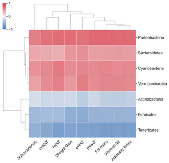Correlations between fecal microbiota and body weight gain and fat parameters analyzed by Spearman’s rank correlation coefficient (rho) at phylum level. Heat map with hierarchical clustering based on correlation coefficient between bacteria and biometric parameters at phylum level. Positive and negative correlations are represented in red and blue respectively. The higher the color intensity the higher the degree of correlation.
