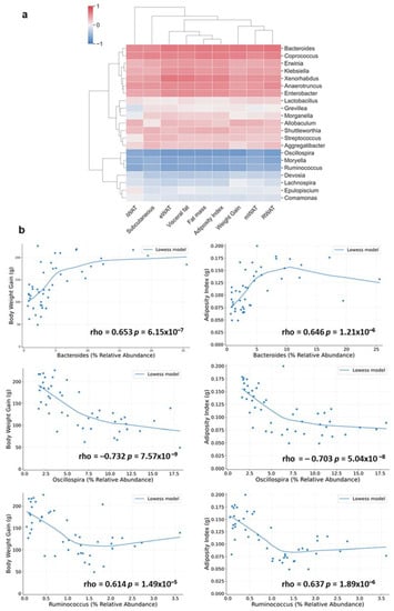 Spearman’s rank-order correlation analysis between fecal microbiota at different taxonomic levels with body weight gain and fat parameters was carried out using Python script as previously described [31]. The FDR (false discovery rate) control for p-value correction in multiple comparisons was applied. The script was developed using PyCharm software (v.2018.2.4, JetBrains s.r.o., Prague, Czech Republic) and Python version 3.7.7.