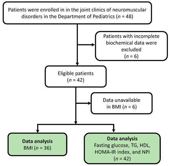Study enrollment chart. A total of 42 patients met the inclusion criteria and underwent all examinations. The BMI values of six patients were unavailable because of difficulty in measuring their height due to multiple joint contractures. BMI: body mass index; TG: triglycerides; HDL: high-density lipoprotein; HOMA-IR: homeostatic model assessment for insulin resistance; NPI: Nakagami parameter index.