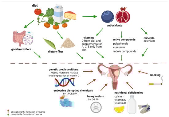 Uterine leiomyomas are the most frequent tumors in women at reproductive age. The origin of these benign neoplasms is multifactorial. Genetic, inflammatory, hormonal, and other associated factors play an important role in uterine fibroids (UFs) development. Molecular analysis of this type of tumors points towards the mediator complex subunit 12 (MED12) mutations and high mobility group AT-hook 2 (HMGA2). The above genetic variants have different gene expression profiles [,,]. The diversity of metabolic processes and reduced levels of specific vitamins and other co-factor metabolites enable tumor growth and formation. This process is conditioned by alterations in enzyme function and signaling pathways []. MED12 mutations are associated with the induction of gene expression of wingless-type mouse mammary tumor virus integration site family, member 4 (Wnt4), and activation of β-catenin signaling in UFs []. The activation of mammalian target of rapamycin (mTOR) pathway can also be responsible for the growth of fibroids []. Oxidative stress has also been indicated as a potential factor []. Profibrotic tumors can form a result of the imbalance between connective tissue production and degradation. Oxidative stress is involved in the deposition of extracellular matrix (ECM) components in myoma, such as collagen, proteoglycan, and fibronectin []. Local and general inflammatory status may also present as a possible mechanism underlying the onset of myomas [,,]. There is a growing body of knowledge on the management and conservative treatment of UFs. Dietary components can alter various factors associated with uterine myoma formation and have both promoting and inhibiting effects on tumor formation and growth [,,,,,,,,,].