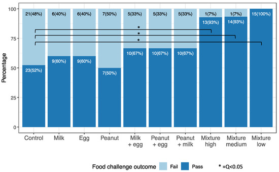 Figure 2 indicates the results of oral food challenges (OFCs). The percent of participants able to consume 8 g of protein was significantly higher in all mixed protein groups compared to the controls (q < 0.05). There were 44, 14, and 14 participants who had available OFC outcomes in the control, peanut, and mixture high groups, respectively. Interestingly, results from questionnaires demonstrated that those on the mixture diet were more apt to diversify the diet of their infant compared to single, double, and control groups (Appendix A Table A1).