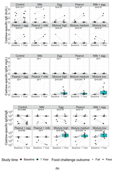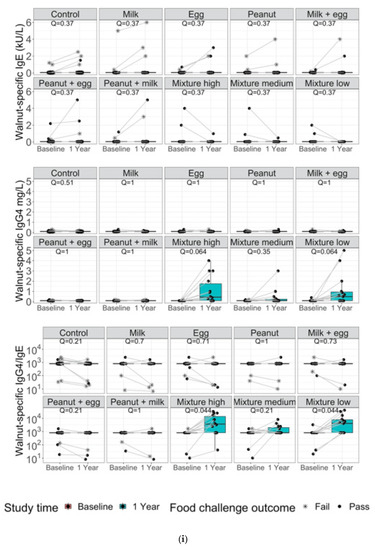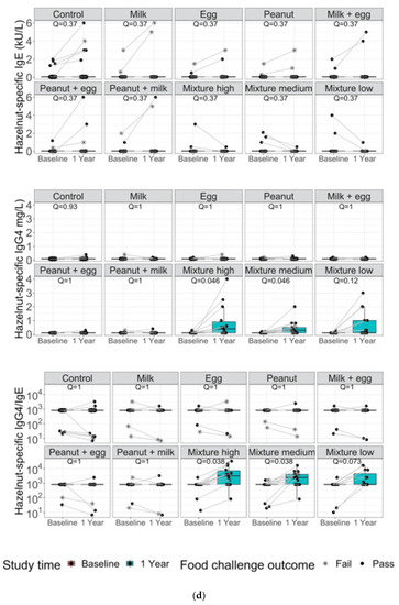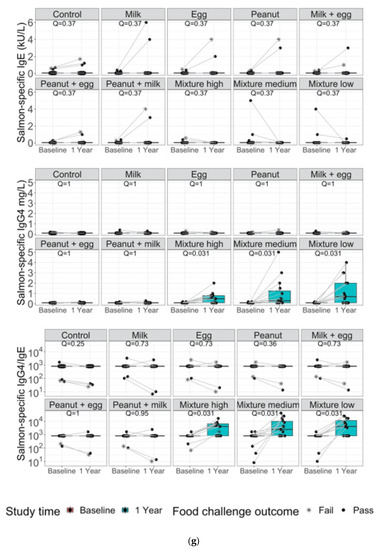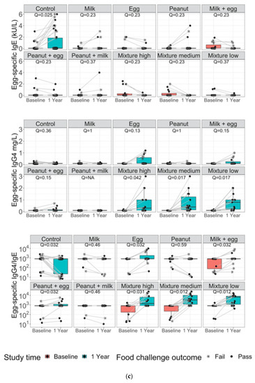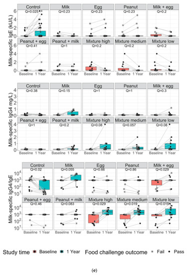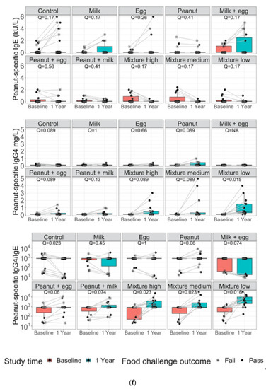 Specific IgG4, sIgE and IgG4/IgE ratios for all 10 allergens are shown in Figure 3a–j. The IgG4/IgE ratios for all mixed protein groups (low, medium, and high) were significantly higher at end of study compared to baseline (q < 0.1), even for peanut, egg, or milk compared to single early intervention active arms. The increase in the ratio can be mainly attributed to increases in IgG4 concentration rather than decreases in IgE. Peanut, milk, and egg biomarkers show improvement compared to control, however specificity was demonstrated only with peanut, milk, and egg containing food, respectively.