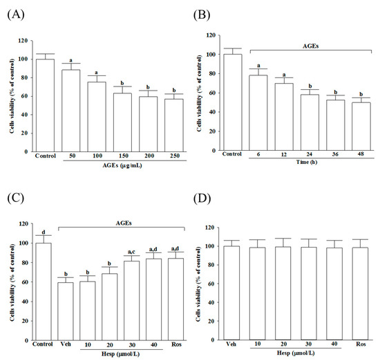 Changes to the reduced cell viability in AGE-induced SH-SY5Y cells. (A) SH-SY5Y cells were received 24 h prior to AGE exposure at various concentrations. (B) Incubation of SH-SY5Y cells with 200 μg/mL of AGEs for various periods. (C) Treatment of SH-SY5Y cells for 1 h with indicated concentrations of hesperetin (hesp; 10–40 μmol/L) or rosiglitazone (Ros; 10 μmol/L); after that, exposure to 200 μg/mL of AGEs for another 24 h. (D) Incubation of SH-SY5Y cells with indicated concentrations of hesp (10-40 μmol/L) or Ros (10 μmol/L) for 24 h without 200 μg/mL of AGE exposure. An MTT assay used cell viability determination; the value was expressed as a percentage of the control group from untreated cells. The results are presented as the mean ± SD of five independent experiments performed triplicate (n = 5). a p < 0.05 and b p < 0.01 when compared to the data from the untreated control group (control). c p < 0.05 and d p < 0.01 when compared to the data from the vehicle (Veh)-treated cells.