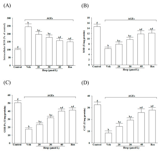 Influences on the ROS level and the antioxidant enzymes activities in SH-SY5Y cells under AGE stimulation. Cells were received 1 h pretreatment with hesperetin (hesp; 20–40 μmol/L) or rosiglitazone (Ros; 10 μmol/L), continued to 24 h AGE (200 μg/mL) exposure. (A) Intracellular ROS level was measured by the oxidation-sensitive fluoroprobe DCFH-DA. The activities of (B) SOD, (C) GSH-Px, and (D) CAT were qualified by commercial assay kits. The results are presented as the mean ± SD of five independent experiments performed triplicate (n = 5). a p < 0.05 and b p < 0.01 when compared to the data from the untreated control group (control). c p < 0.05 and d p < 0.01 when compared to the data from the vehicle (Veh)-treated cells.