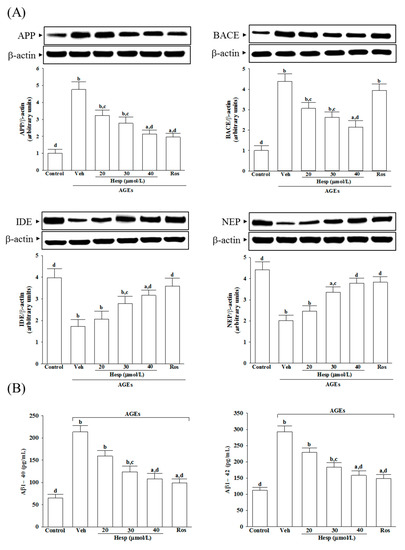 Changes in APP processing and Aβ secretion in SH-SY5Y cells under AGE stimulation. Cells were received 1 h pretreatment with hesperetin (hesp; 20–40 μmol/L) or rosiglitazone (Ros; 10 μmol/L), continued to 24 h AGE (200 μg/mL) exposure. (A) A representative Western blot analyzes the relative levels of amyloid precursor protein (APP), β-site APP-cleaving enzyme (BACE), insulin degrading enzyme (IDE), and neprilysin (NEP). Band densities were normalized with β-actin. (B) ELISA assay was used to determine the level changes in Aβ1-40 and Aβ1-42. The results are presented as the mean ± SD of five independent experiments performed triplicate (n = 5). a p < 0.05 and b p < 0.01 when compared to the data from the untreated control group (control). c p < 0.05 and d p < 0.01 when compared to the data from the vehicle (Veh)-treated cells.