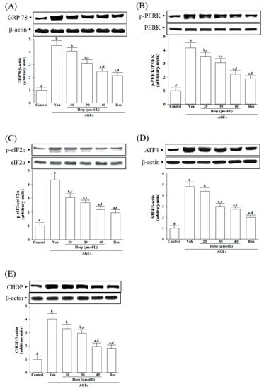 Investigation on the related molecules in ER stress in SH-SY5Y cells under AGE stimulation. Cells were received 1 h pretreatment with hesperetin (hesp; 20–40 μmol/L) or rosiglitazone (Ros; 10 μmol/L), continued to 24 h AGE (200 μg/mL) exposure. A representative Western blot analyzed the relative levels of (A) 78-kDa glucose-regulated protein(GRP78), (B) p-protein kinase-like endoplasmic reticulum kinase(PERK), PERK, (C) p-eukaryotic initiation factor (eIF) 2α, eIF2α, (D) activating transcription factor (ATF)4, and (E) C/EBP homologous protein (CHOP). The band densities for protein were normalized to the β-actin band intensity. The ratio of phosphoprotein to total protein in PERK (p-PERK/PERK) and eIF2α (p-eIF2α/eIF2α) is also shown. The results are presented as the mean ± SD of five independent experiments performed triplicate (n = 5). a p < 0.05 and b p < 0.01 when compared to the data from the untreated control group (control). c p < 0.05 and d p < 0.01 when compared to the data from the vehicle (Veh)-treated cells.