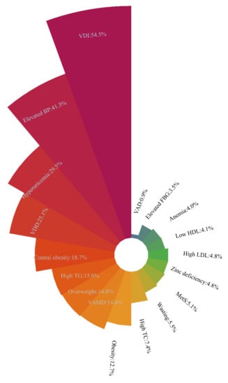 Sequence of prevalence of the relevant nutritional and health problems among school-age children and adolescents. VDI = vitamin D inadequacy; elevated BP = elevated blood pressure; VDD = vitamin D deficiency; high TG = high triglyceride; VAMD = vitamin A marginal deficiency; high TC = high total cholesterol; MetS = metabolic syndrome; high LDL = high low-density lipoprotein; low HDL = low high-density lipoprotein; elevated FBG = elevated fasting blood glucose; VAD = vitamin A deficiency. MetS and its five components (central obesity, high TG, low HDL, elevated BP, and elevated FBG) were diagnosed according to the modified criteria of the National Cholesterol Education Program-Adult Treatment Panel III (NCEP-ATP III) for children and adolescents aged 7–17 years.