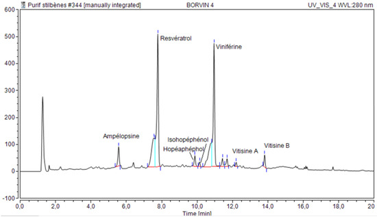 Grape polyphenols used in this study were obtained by reactive extrusion from grape canes of Ugni blanc varieties, specific to the Cognac country. The concentrated aqueous extract obtained exhibits the HPLC profile shown in Figure 2, with mass percentages for RSV of 4.9% and for VNF of 10.8%, but also other known oligomers of the stilbenoid family (ampelopsin, vitisin A and B).