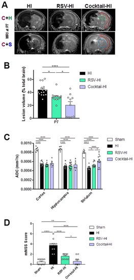 Pups were anesthetized with isoflurane (4% for induction and 1.5% for maintenance) and body temperature was maintained at 35.5 ± 0.5 °C during acquisition with a water-heated MRI bed. Brain lesion volumes and edema severity were assessed by Diffusion Weighted Imaging (DWI): 20 axial slices (0.7 mm thick), 30 directions, b-value 1000 s/mm2, echo time (TE) = 24 ms, repetition time (TR) = 2 s, Δ = 8.11 ms, δ = 2.5 ms, total duration = 17 min 04 s. MRI Analysis. Measurements were performed with Paravision 6.0.1 software (Bruker BioSpin, Karlsruhe, Germany). For the different time points and for each pup, the brain damage area as well as the total brain surface were delineated on the 20 adjacent slices of the DWI (slice thickness: 0.7 mm). Lesion volumes were expressed as a percentage of the total brain volume. At P7, apparent diffusion coefficient (ADC) values (mm2/s) were measured in the cortex, hippocampus, and striatum, on the ADC maps resulting from DWI acquisition, as previously described [16]. For MRI analyses, lesion volumes and ADC were measured as previously described [18].