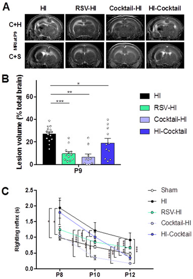 To evaluate the potential curative effects of maternal supplementation, the polyphenolic cocktail was administered in the drinking water of the breastfeeding females just after the HI event in pups (HI-Cocktail group). Brain lesion volumes were evaluated by diffusion MRI at P9 for all groups (Figure 4A), which corresponded to 48 h of maternal supplementation for the HI-Cocktail group. Brain lesion volumes of pups in the HI-Cocktail group were smaller than those of the pups in the HI group (19 ± 4% and 27 ± 3% for HI-Cocktail and HI groups, respectively). At this early time point, pups in the Cocktail-HI and RSV-HI groups presented the smallest lesion volumes. At the corresponding time point, behavioral experiments were performed. Early reflexes of pups were evaluated from P8 to P12 (Figure 4B). During righting reflex, whatever the time point, pups of the HI group presented a delay in the accomplishment of the task (Figure 4C). Such a delay was detected for the HI-Cocktail group until P10. From P8 to P12, Cocktail-HI group performed as well as the sham group. At P12, abilities of pups in cocktail-supplemented groups were better than that of pups in the RSV group.