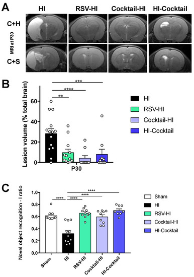 The lasting nature of neuroprotection was evaluated by diffusion MRI at P30 (Figure 5A). At P30, brain lesion appears as a hypersignal (tissue loss). Brain lesion volumes were significantly reduced in the supplemented groups, compared to the HI group (28 ± 5%, 4 ± 3%, 8 ± 5% and 10 ± 3% for HI, Cocktail-HI, HI-Cocktail and RSV-HI groups, respectively) (Figure 5B). Remarkably, hippocampi of supplemented groups were more preserved than that of the HI group. Hippocampal-dependent long-term memory was therefore tested for all groups using the novel object recognition test. For the HI group, HI induced an impairment of long-term memory which was completely counteracted by maternal supplementation for all the supplemented groups, compared to the sham group (Figure 5C).