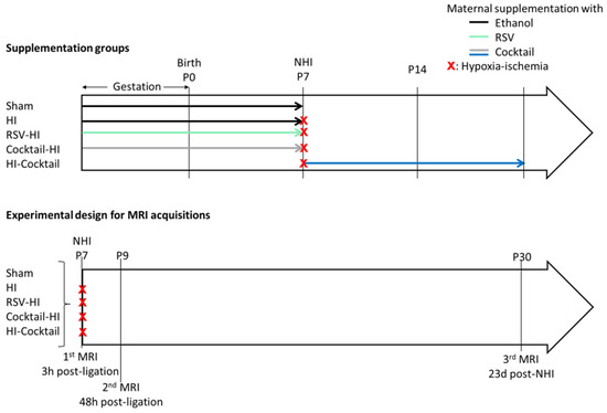 Animals and Nutritional Maternal Supplementation. All of the animal procedures were conducted in accordance with the Animal Experimentation Guidelines of the European Communities Council Directive of November 24, 1986 (86/609/EEC). Protocols met the ethical guidelines of the French Ministry of Agriculture and Forests and were approved by the local ethics committee (CEEA50-ethical approval code 9476). Pregnant Wistar female rats (Janvier Laboratories, France) were received 1 week before delivery (15 days of gestation), kept on light/dark 12 h/12 h cycle. Water was available ad libitum and pregnant females were fed with A03 food (SAFE, Augy, France). For the supplemented condition, a cocktail of polyphenols composed of RSV, PTE (gift from Exinnov, Saint Jean d’Illac, France) and VNF was added to the drinking water of dams for 2 weeks (last week of gestation + first week of breastfeeding; equimolar doses: 0.15 mg/kg/d for RSV and PTE and 0.30 mg/kg/d for VNF). A measurement 16 µL of absolute ethanol were added into the drinking water (200 mL) for the hypoxic-ischemic and sham groups for 2 weeks (last week of gestation + first week of breastfeeding). Five experimental groups were established according to the maternal supplementation plan and occurrence or not of a hypoxic-ischemic event: sham group (pups without maternal supplementation and without NHI); HI group (pups without maternal supplementation and with NHI); RSV-HI group (maternal supplementation with RSV, during two weeks before NHI); Cocktail-HI group (maternal supplementation with the polyphenolic cocktail, during two weeks before NHI) and HI-Cocktail group (NHI and maternal supplementation with the polyphenolic cocktail, during two weeks after NHI).