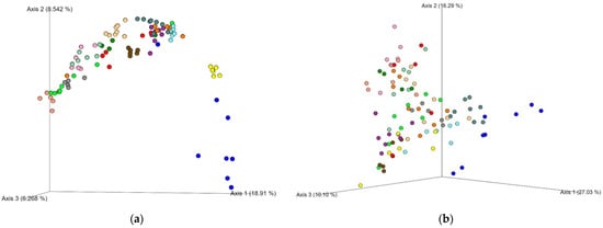 Unweighted (a) and weighted UniFrac (b) for all samples color-coded by the 15 different individuals.
