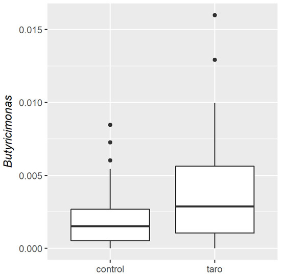 Difference in Butyricimonas between the control (including four baseline samples and the end sample after control intervention) and taro feeding (end samples after taro, taro + probiotic, and taro + beetroot).
