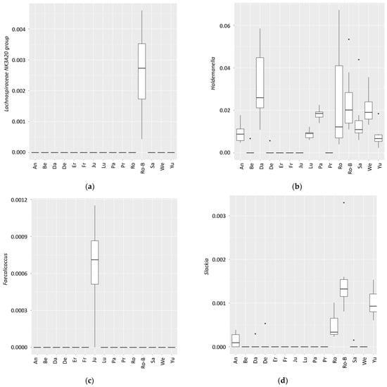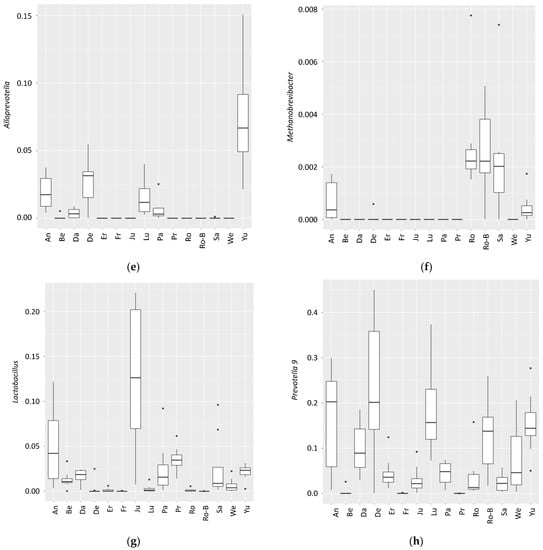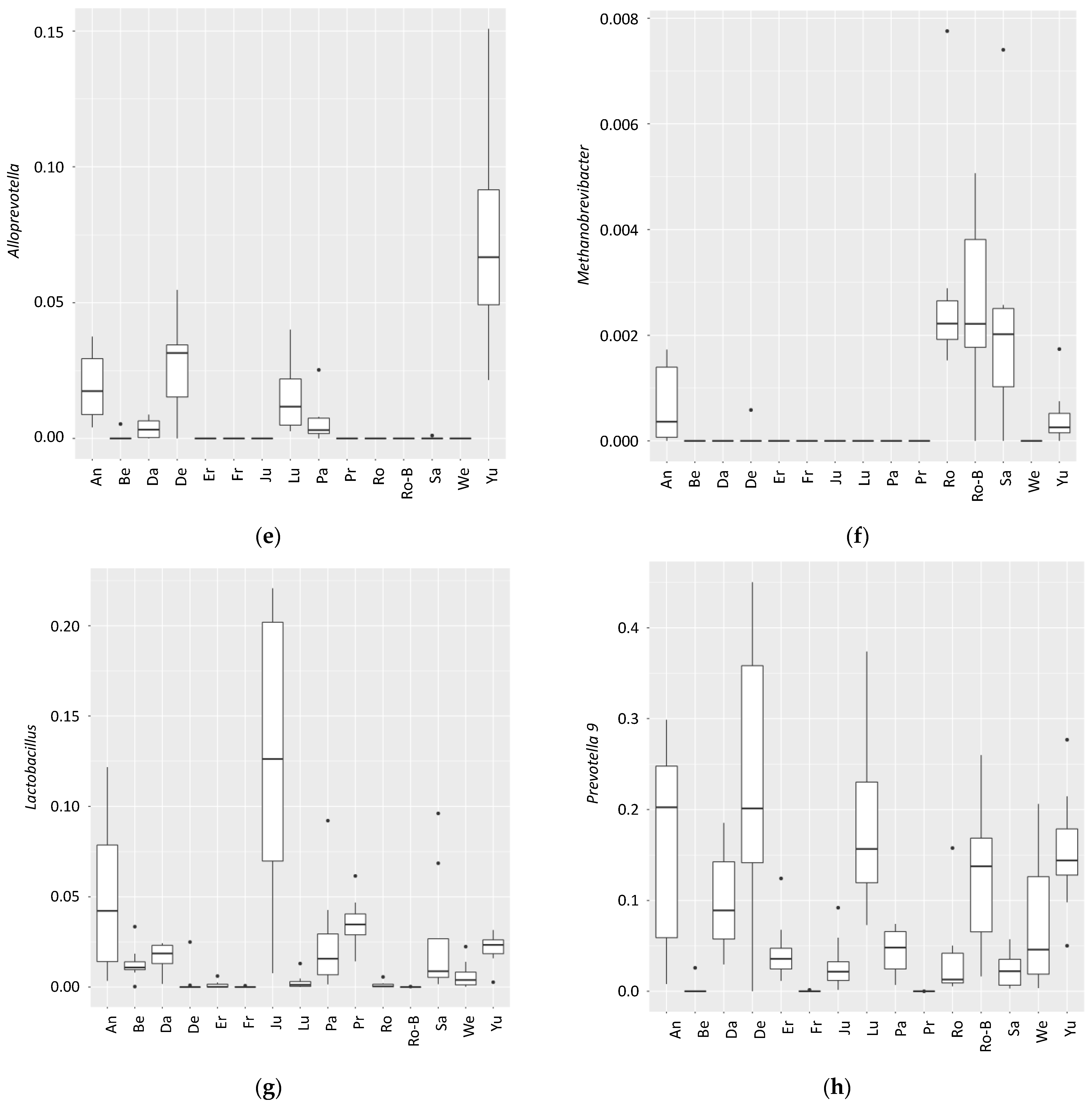 Differences in several taxa between individuals indicating the high interindividual variation in gut microbiota composition. Lachnospiraceae NK3A20 group ((a); q-value = 6.9 × 10−17); Holdemanella ((b); q-value = 4.6 × 10−14); Faecalicoccus ((c); q-value = 5.5 × 10−14); Slackia ((d); q-value = 7.4 × 10−14); Alloprevotella ((e); q-value = 8.3 × 10−14); Methanobrevibacter ((f); q-value = 7.6 × 10−12); Lactobacillus ((g); q-value = 2.2 × 10−11); Prevotella 9 ((h); q-value = 1.8 × 10−10).