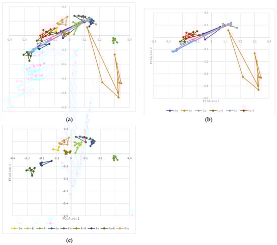 Two first axes of the unweighted PCoA (similar to Figure 1a) for all individuals (a); two first axes of the unweighted PCoA for those individuals with relatively large changes (b); two first axes of the unweighted PCoA for those individuals with more resilient microbiota (c). Samples are color-coded according to the different individuals (see legends of (b,c)). Axis 1 explains 18.9% and axis 2 8.5% of the variability between samples, respectively.