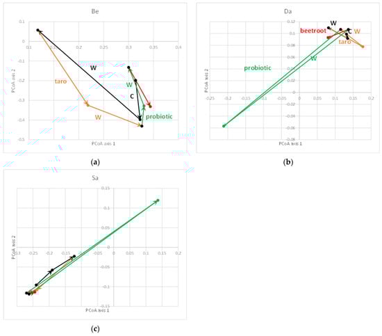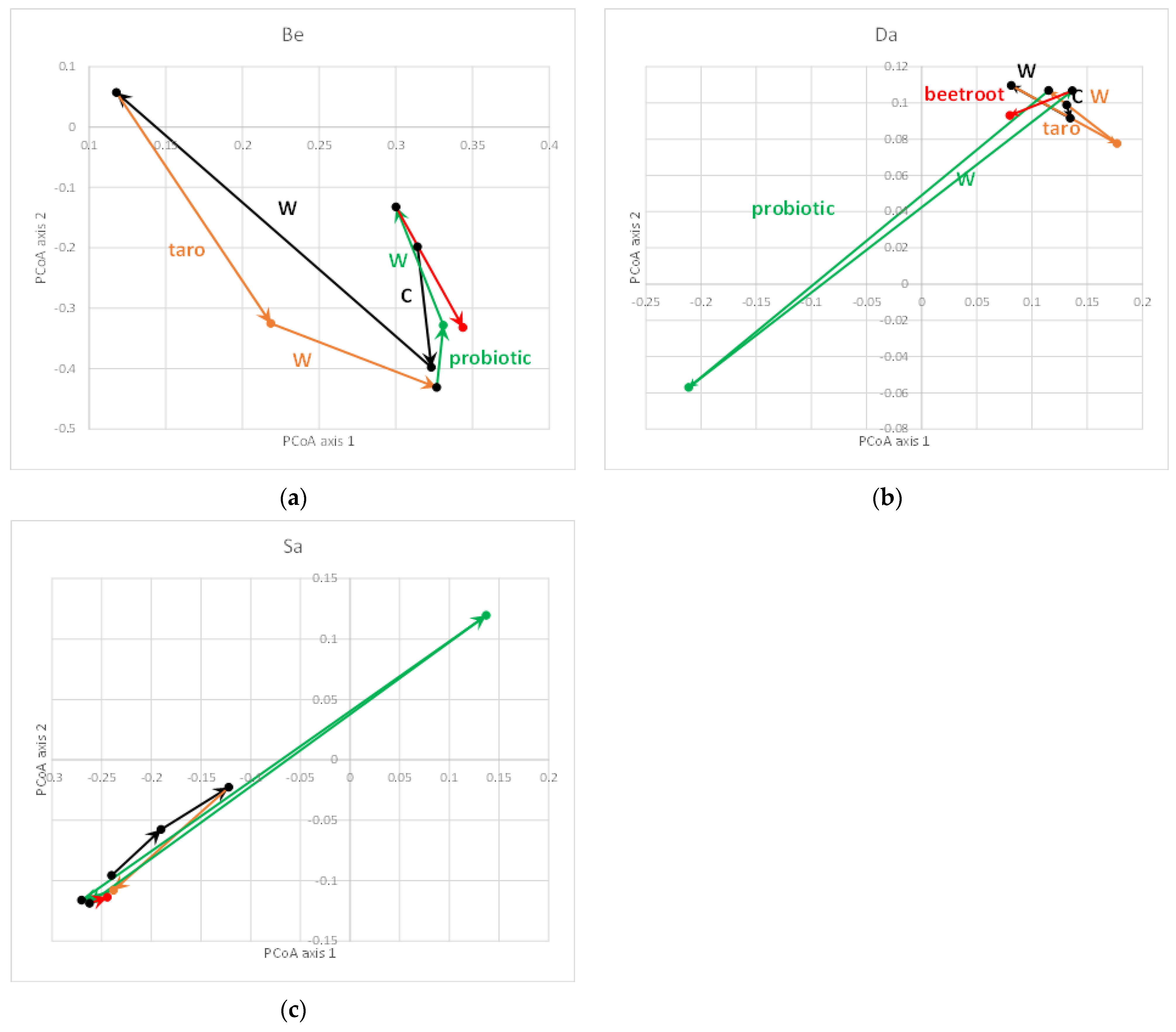 For the three individuals with the largest changes, the trajectory of the samples along the first two axes of the unweighted UniFrac PCoA are provided in Figure 5. In one individual (Be), the largest change was observed during the wash-out (W) period after the run-in period (C). In this individual, every treatment led to relatively large changes (in comparison with the other individuals). For the other two individuals (Da and Sa), the large change in β-diversity was caused by the addition of the probiotic to the diet whereas after the wash-out period, the microbiota composition was again similar to the other samples. The other samples of these individuals clustered more closely together, as seen for all samples for all individuals in Figure 4c. However, as can be observed in Figure 5b,c, the direction of the change in these two individuals was the complete opposite. No consistent changes between the two individuals were observed (not shown). In both individuals, Lactobacillus (to which Lactiplantibacillus in the Greengenes database belongs) increased by a factor of 1.5 (from 1.6% to 2.4% relative abundance (RA)) in individual Da and a factor of ~10 (from 1% to 9.6% RA) in individual Sa; this clearly was not reflected in the change in β-diversity as these were in an opposite direction. Moreover, the increase in Lactobacillus upon probiotic feeding was not consistent for other individuals, e.g., individual An showed a large decrease from 12.1% to 0.3% after the taro + probiotic treatment. In other individuals, there was no change in this taxa (e.g., 0% and 0% for individual Be (with another trajectory during the probiotic treatment compared with Da and Sa; Figure 5a), 1% and 1% for individual Er, and 22.1% and 20.7% for individual Ju, respectively).