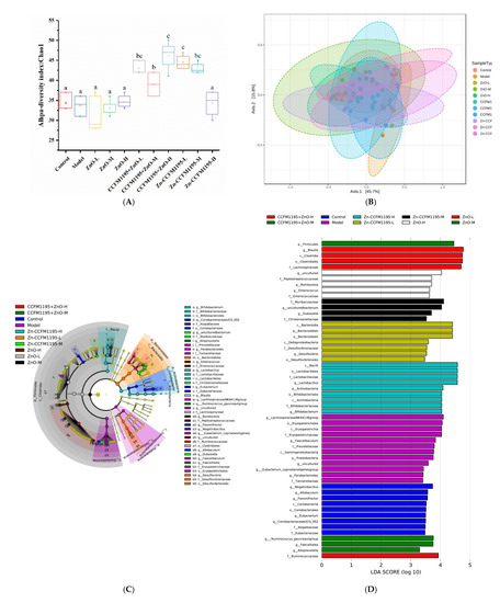 Beta diversity analysis is a technique for analyzing the variations in species’ diversity of samples, as a tool for studying the similarities of the overall community composition in samples. Individual differences among samples and sample duplications within groups were calculated using PCoA (Figure 8B). Samples from the model group, which had low species diversity and abundance, and the CCFM1195 + ZnO-H group, which displayed high species diversity and abundance, were separated from samples from the other groups by a significant distance, although there was no discernible difference. The close proximity of the other groups showed that their microbial compositions were more comparable.