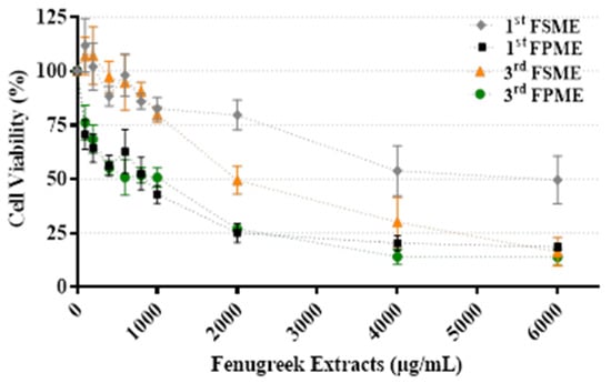 Herein, the FPMEs and FSMEs reduced cell viability in a dose- and time-dependent manner, consistent with two previous studies on seeds [15,16], and showed these effects for the first time with fenugreek sprout extracts. Sebastian and Thampan [16] reported that an ethanolic extract of fenugreek seeds at a concentration of 50 µg/mL resulted in a 70% decrease in MCF-7 cell viability during a 72-h culture [16]. Ahmed et al. [15] reported the IC50 values of FSMEs against MCF-7 cell lines to be in the range of 2850–3140 µg/mL. Meanwhile, the IC50 values determined by [15] were in the range of 1400–5605 µg/mL, as similarly observed in the current study. However, the processing techniques of fenugreek seeds have been shown to affect the nutritional/chemical profile and antioxidant activity of fenugreek extracts [17].
