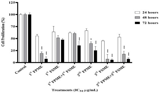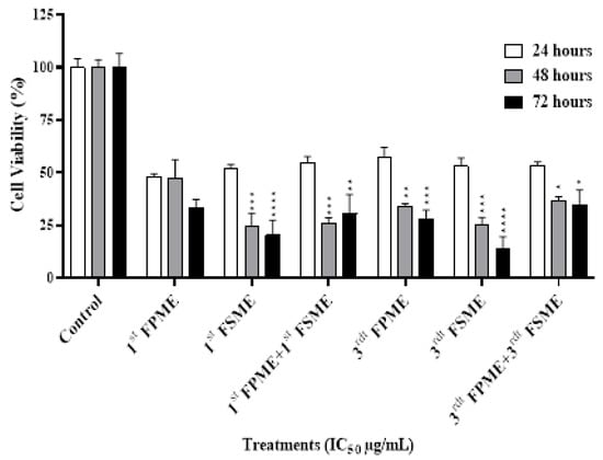 Fenugreek-inhibited cell growth in MCF-7 human breast cancer cells. The viability of the cells was analysed using cell MTT assays. 1st Fenugreek Sprouts Methanol Extraction [1st FPME], 3rd Fenugreek Sprouts Methanol Extraction [3rd FPME], 1st Fenugreek Seeds Methanol Extraction [1st FSME], 3rd Fenugreek Seeds Methanol Extraction [3rd FSME]. The IC50 treatments of the first FSME at 5605 µg/mL, first FPME at 812 µg/mL, third FSME at 1400 µg/mL, and third FPME at 526 µg/mL for 24, 48, and 72 h decreased the viability of the MCF-7 cells in a time-dependent manner. The values are presented as means n = 6 ± SEM. The data were analysed using a one-way ANOVA test. Different asterisks indicate significant differences between data in the same group (* p ≤ 0.05, ** p ≤ 0.01, *** p ≤ 0.001, and **** p ≤ 0.0001).