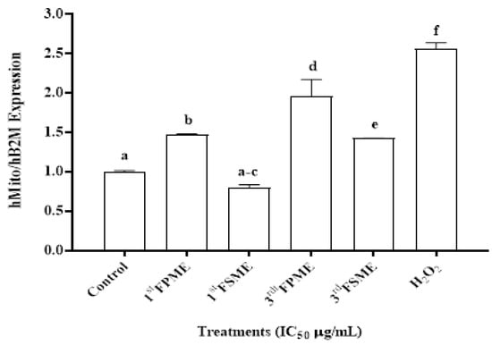 The mtDNA relative content in the MCF-7 cells. Amplified by RT-PCR and normalised to the human Beta-2 microglobulin [hB2M] nuclear gene after IC50 treatment of the 3rd FSME at 5605 µg/mL, 1st FPME at 812 µg/mL, 3rd FSME at 1400 µg/mL, and 3rd FPME at 526 µg/mL in the MCF-7 cells for 24 h; H2O2 was used as a positive control. 1st Fenugreek Sprouts Methanol Extraction [1st FPME], 3rd Fenugreek Sprouts Methanol Extraction [3rd FPME], 1st Fenugreek Seeds Methanol Extraction [1st FSME], 3rd Fenugreek Seeds Methanol Extraction [3rd FSME], hydrogen peroxide [H2O2] (Sigma H1009). The values are presented as means n = 4 ± SEM. The data were analysed using a two-way ANOVA test. The different letters on top of the bars indicate significant differences (p ≤ 0.05) between the data.