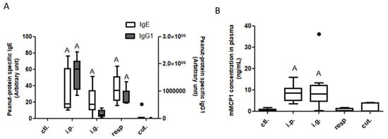 Assessment of food allergy induction after exposure through different routes: Peanut-specific IgE (open bars) and IgG1 (gray bars) (A) and mMCP1 (B) concentrations in plasma collected 1 h after an oral food challenge from mice previously exposed through the intraperitoneal (i.p.), intragastric (i.g.), respiratory (resp.), or cutaneous (cut.) routes, and in non-exposed mice (ctl.; control mice). “A”: indicates a significant difference between indicated group and control group (p < 0.05 using non-parametric Kruskal–Wallis and Dunn’s post-test). Bold black dots represent outliers.