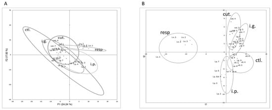 Multivariate analysis of immune cellular constituents assessed for each mouse exposed through the i.p., i.g., resp., or cut. routes. (A) Graph of individuals on the first two dimensions of non-supervised PCA. (B) Graph of individuals after modelling of all the data using supervised PLS-DA and route of exposure as the explicative variable.
