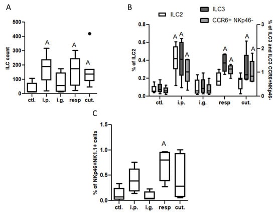 Innate lymphoid cells in lamina propria from mice exposed through the i.p., i.g., resp., or cut. routes compared to ctl. mice: (A) ILC count (CD45+Lin−CD4−CD127+ cells); (B) ILC2 (ST2+NK1.1− cells within ILC, empty bars), ILC3 (ST2−NK1.1− cells selected within ILC; dark gray bars), and CCR6+NKp46− ILC3 (light gray bars) frequencies; and (C) NK cells (NK1.1+NKp46+ cells selected within CD45+lin−, then CD4−CD127− cells). All frequencies are expressed using CD45+ cells as a reference. “A” indicates a significant difference between indicated group and control mice (p < 0.05 using non-parametric Kruskal–Wallis and Dunn’ post-Test). The bold black dot represents an outlier.