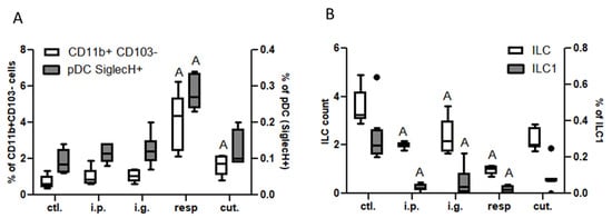 In the lung tissue, we observed an increased frequency of CD11b+CD103− DC subtype and of pDC (SiglecH+) in mice exposed through the respiratory route, and to a lesser extent in mice exposed through the cutaneous route (Figure 5A). Total ILC counts and ILC1 frequency in the lung tissue were significantly lower in i.p., i.g., and resp. groups than in control mice (Figure 5B).