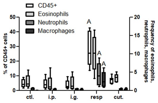 Inflammatory cells in BAL: Frequencies of CD45+ (empty bars), eosinophils (light gray bars), neutrophils (dark gray bars), and macrophages (black bars) in BAL from different groups of exposed mice. Inflammatory cells were defined within CD45+CD3− cells as neutrophils (Ly6C+Ly6G+), eosinophils (SiglecF+CCR3+ within LyG6−), and macrophages (Ly6C−F4/80+ within LyG6−). All frequencies are expressed using CD45+ cells as a reference. “A” indicates a significant difference between indicated group and control group (p < 0.05 using non-parametric Kruskal–Wallis and Dunn’s post-Test).