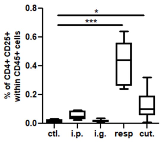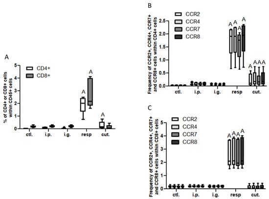On the other hand, a less intense, albeit significant, influx of CD4+ T cells expressing CCR2, CCR4, CCR7, and CCR8 (Figure 7A,B) and of CD4+ CD25+ T cells (Figure 8) was also observed in BAL from mice exposed through the cutaneous route compared to control mice.