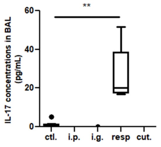IL-17 concentrations in BAL from mice exposed through the different routes. ** p < 0.01: Using non-parametric Kruskal–Wallis test and Dunn’s post-test when comparing all groups to control one (non-exposed mice). The bold black dot represents an outlier.