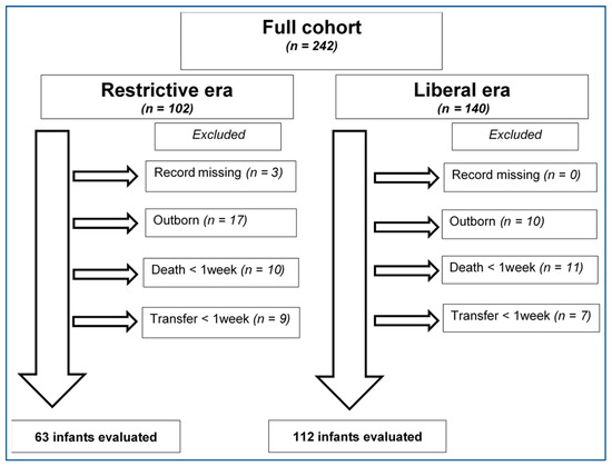 The groups were similar in GA and birth weight (Table 1). The administration of antenatal steroids <24 h prior to delivery was more frequent in the later (LIBERAL) era (p < 0.05, Table 1). Including all infants admitted, survival to discharge was 77/102 (75%) and 119/140 (85%) in RESTRICTED and LIBERAL eras, respectively (p = 0.0696).