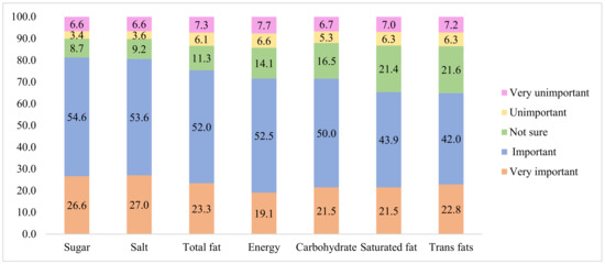 The respondents were asked to answer the following question: ‘How important is it to you if the following nutrients are labeled on FOPL?’. The nutrients included energy, total fat, saturated fat (acid), trans fat (acid), carbohydrate, sugar and salt (sodium). The items were assessed on a 5-point Likert scale (very unimportant; unimportant; not sure; important; very important).