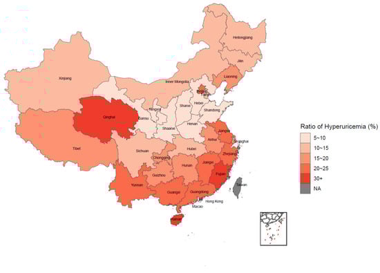 Distribution of hyperuricemia among Chinese elderly by weighted prevalence.
