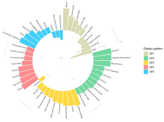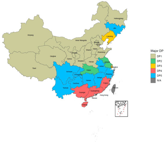 We finally extracted five dietary patterns by factor analysis, which totally explained the 30.37% variance of all 27 food variables. DP1 was named as the “Typical Chinese pattern”, DP2 as the “Modern Chinese pattern”, DP3 as the “Western pattern”, DP4 as the “Animal products and alcohol pattern”, and DP5 as the “Tuber and fermented vegetables pattern” based on the characteristics of factor loadings, which were 0.2 or higher in each dietary pattern, as shown in Figure 2. Further information on factor loadings is available in Supplementary Table S2. The distribution of DPs in China is shown in Figure 3. The DP with the highest proportion in each province/municipality/autonomous was considered as the representative DP in that area. All the typical patterns existed in the north of China. The modern Chinese pattern showed in both the Jiangsu and Hubei provinces. The Western pattern appeared in the Liaoning province and Shanghai city. The animal products and alcohol pattern and tuber and fermented vegetables pattern were mainly in southern China. The former was presented in the inland parts, while the latter was in the coastal regions. The proportion of each DP in detail is available in Supplementary Table S3.