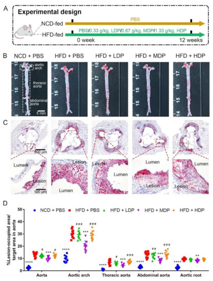 ApoE−/− mice were treated with DP through oral gavage daily for 12 weeks (Figure 1A). The effect of DP on plaque development was assessed by measuring red oil-stained lipid areas within the aortas and the aortic roots among the NCD + PBS, HFD + PBS, HFD + LDP, HFD + MDP, and HFD + HDP groups (Figure 1B,C). HFD + PBS group resulted in a 5.4-fold and 3.7-fold increase in aortic and aortic root lesion area in ApoE−/− mice compared with the NCD + PBS group (Figure 1D). In comparison with the HFD + PBS group, oral treatment with the MDP substantially reduced the lesion area of the aorta and the aortic root by 23% and 16%, respectively, whereas the lesion areas in the HFD + LDP and HFD + HDP groups were not significantly (p > 0.05) changed (Figure 1D), indicating the alleviative effect of the MDP on atherosclerotic lesions.