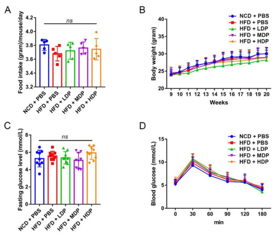 The effects of dual-protein (DP) nutrition on physiological conditions of high-fat-diet-fed ApoE−/− mice. ApoE−/− mice were grouped and treated as in Figure 1. (A) Daily food intake was recorded for five consecutive days and the average daily food intake was calculated. (B) Body weight was recorded once a week throughout the experimental period. (C) Fasting blood glucose level was measured after fasting for 12 h. (D) Glucose tolerance test was performed after 11 weeks of DP administration. Data are presented as mean ± SD. n = 9, ns indicates no significance. Phosphate-buffered saline (PBS), normal-chow-diet (NCD), high-fat-diet (HFD), low-dose dual-protein (LDP), middle-dose dual-protein (MDP), high-dose dual-protein (HDP).