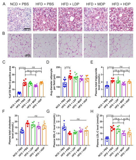 The effect of DP on lipid metabolism in ApoE−/− mice was investigated since dyslipidemia is an important risk factor for atherosclerosis [3]. Lipid deposition in the liver of ApoE−/− mice was observed by Oil Red O staining (Figure 3A). It was found that the ApoE−/− mice fed with a high-fat diet had varying degrees of lipid deposition. Compared with the HFD + PBS group, the proportion of lipid droplets (Oil Red O staining) in the HFD + MDP group was significantly reduced by 19.75%, while the HFD + LDP group and HFD + HDP group were not improved (Figure 3A,C). White adipocytes were observed by HE staining (Figure 3B). The size of adipocytes in ApoE−/− mice increased by 16.15% in the HFD + PBS group compared to the NCD + PBS group, while DP intervention did not affect the adipocyte size (Figure 3D). The blood lipid level of each group was determined since it has been reported that a high-fat diet can lead to hyperlipidemia in ApoE−/− mice compared with a normal-chow diet [19]. Treatment with MDP resulted in a 20.47% reduction in TG level, but the other two doses of DP did not significantly change the TG level (Figure 3E). Plasma TC, HDL-C, and LDL-C levels were also detected, and significant differences were not found in TC and HDL-C (Figure 3F,G); however, the level of LDL-C in the HFD + MDP and HFD + HDP, especially in HFD + MDP, decreased significantly (Figure 3H). In sum, MDP can significantly reduce plasma TG and LDL-C levels, indicating that MDP was better than LDP and HDP in regulating lipid metabolism.
