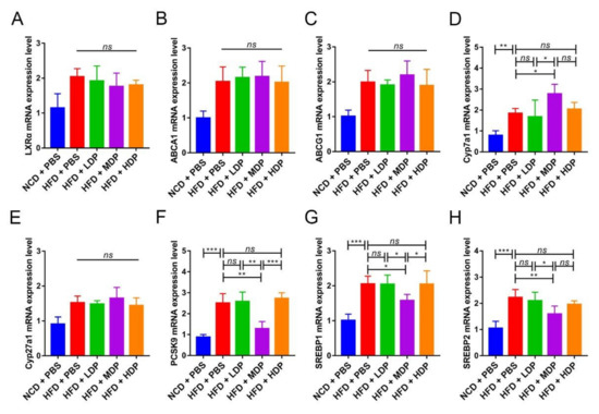 The relative expression of lipid metabolism-related genes was measured in the liver of ApoE−/− mice. LXRα regulates cholesterol reversal by regulating downstream genes such as ABCA1 and ABCG1, which are mainly expressed in the liver [23]. The mRNA expression levels of LXRα, ABCA1, and ABCG1 were quantified, and significant differences were not observed among high-fat-diet-fed groups (Figure 4A–C). However, Cyp7a1, the downstream gene of LXRα and a regulator of the production of bile acids, was remarkably upregulated in the HFD + MDP group compared to the HFD + PBS group (p < 0.05) (Figure 4D). Cyp27a1, which is mostly involved in the alternative pathway, was not affected by DP treatment (Figure 4E). PCSK9 is involved in LDL-C metabolism as an independent factor of high plasma LDL-C level [24]; MDP significantly decreased PCSK expression compared to other added high-fat-diet-fed groups (p < 0.05) (Figure 4F). Compared with the HFD + PBS group, the expression levels of SREBP1 and SREBP2 were also significantly decreased in the HFD + MDP group. Hence, MDP may accelerate cholesterol metabolism by upregulating Cyp7a1 and downregulating PCSK9 and SREBP1.